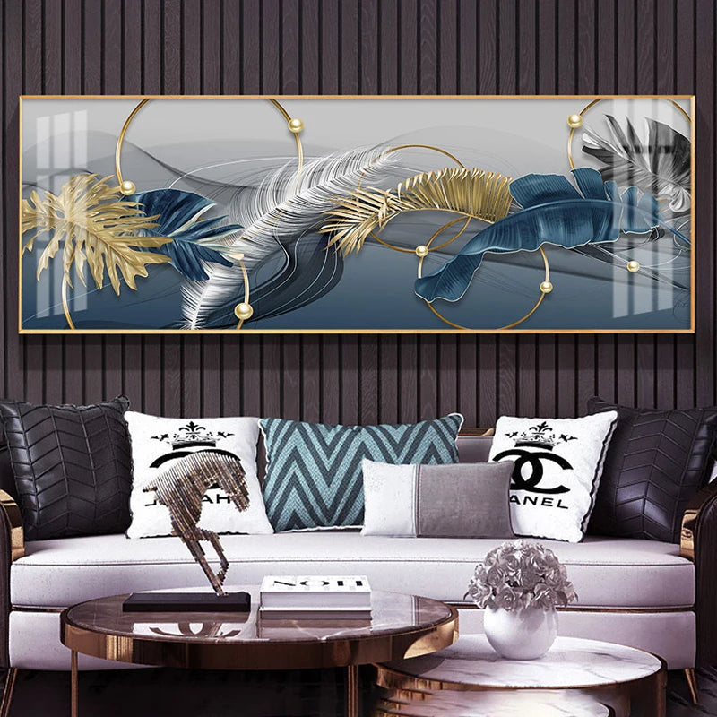 Enhance your space with our exquisite canvas artwork featuring golden feathers and a striking deer design, perfect for adding a touch of luxury and sophistication to any living room.